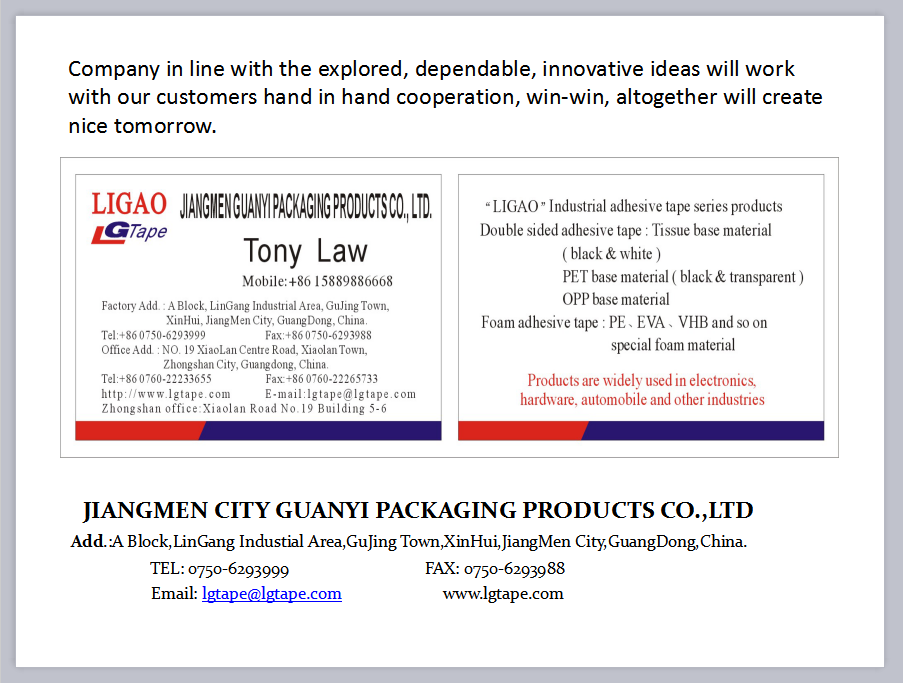 Jiangmen City Ligao New Material Technology Co., LTD is a private enterprise which was established in 2004, integral plant is located in Lianfeng industrial zone. At the initial stage we mainly focus on producing, processing and selling pressure sensitive glue.